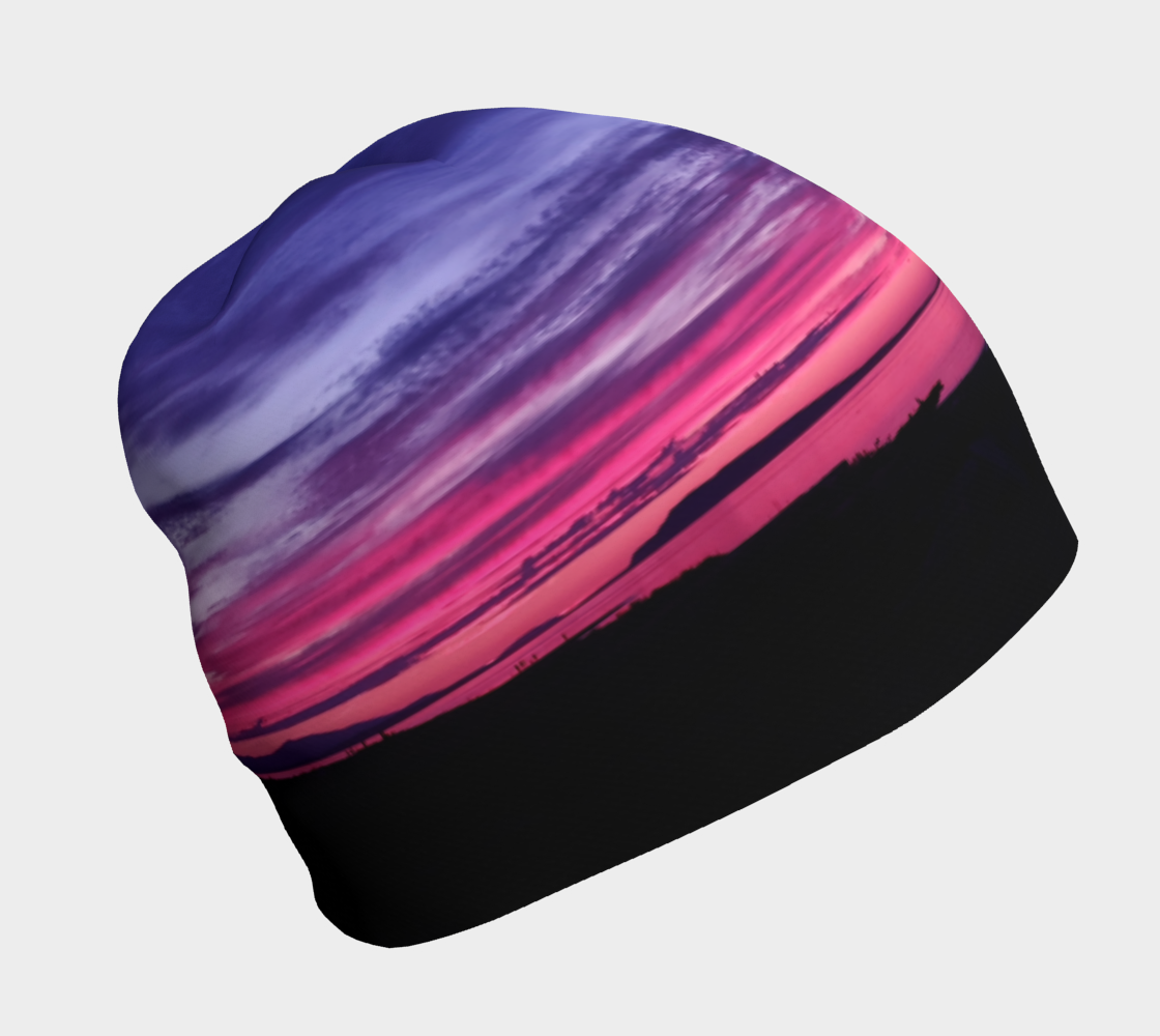 This super comfortable, relaxed fit beanie features a beautiful photo of Qualicum Beach, BC at dusk.